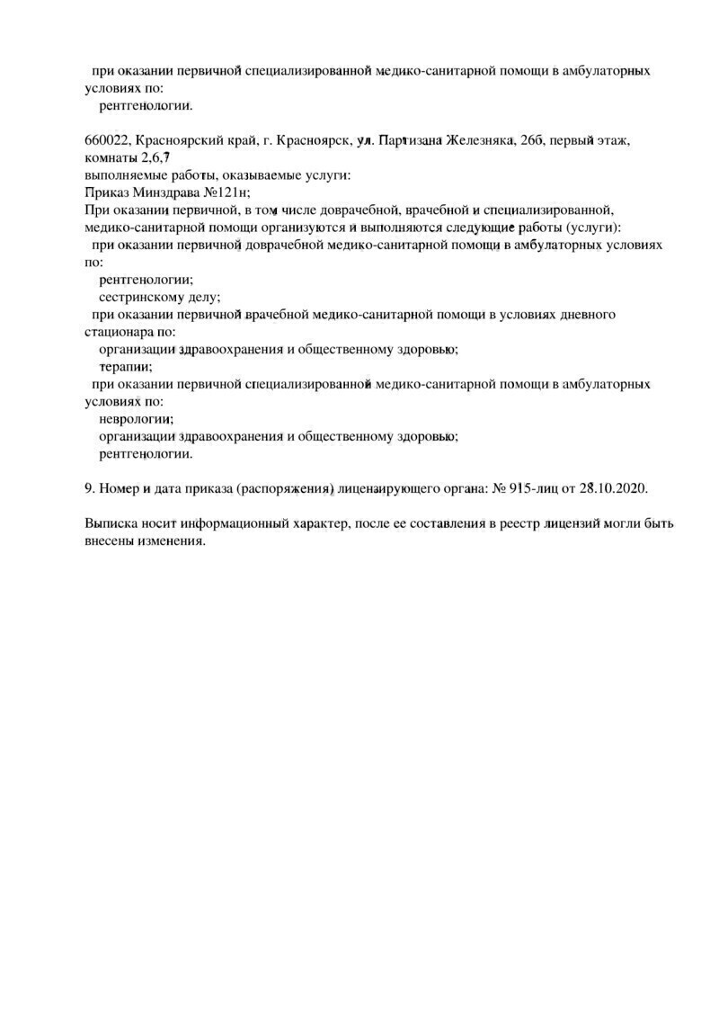 Проводит рентгенографию легких, костей носа, черепа, позвоночника, ребер, грудины, ключицы, костей таза, костей конечностей, всех суставов, шейного отдела позвоночника, грудного и пояснично-крестцового отделов позвоночника, все рентгенологические исследования, используемые в оториноларингологии, цистографию, внутривенную урографию, гистеросальпингографию.